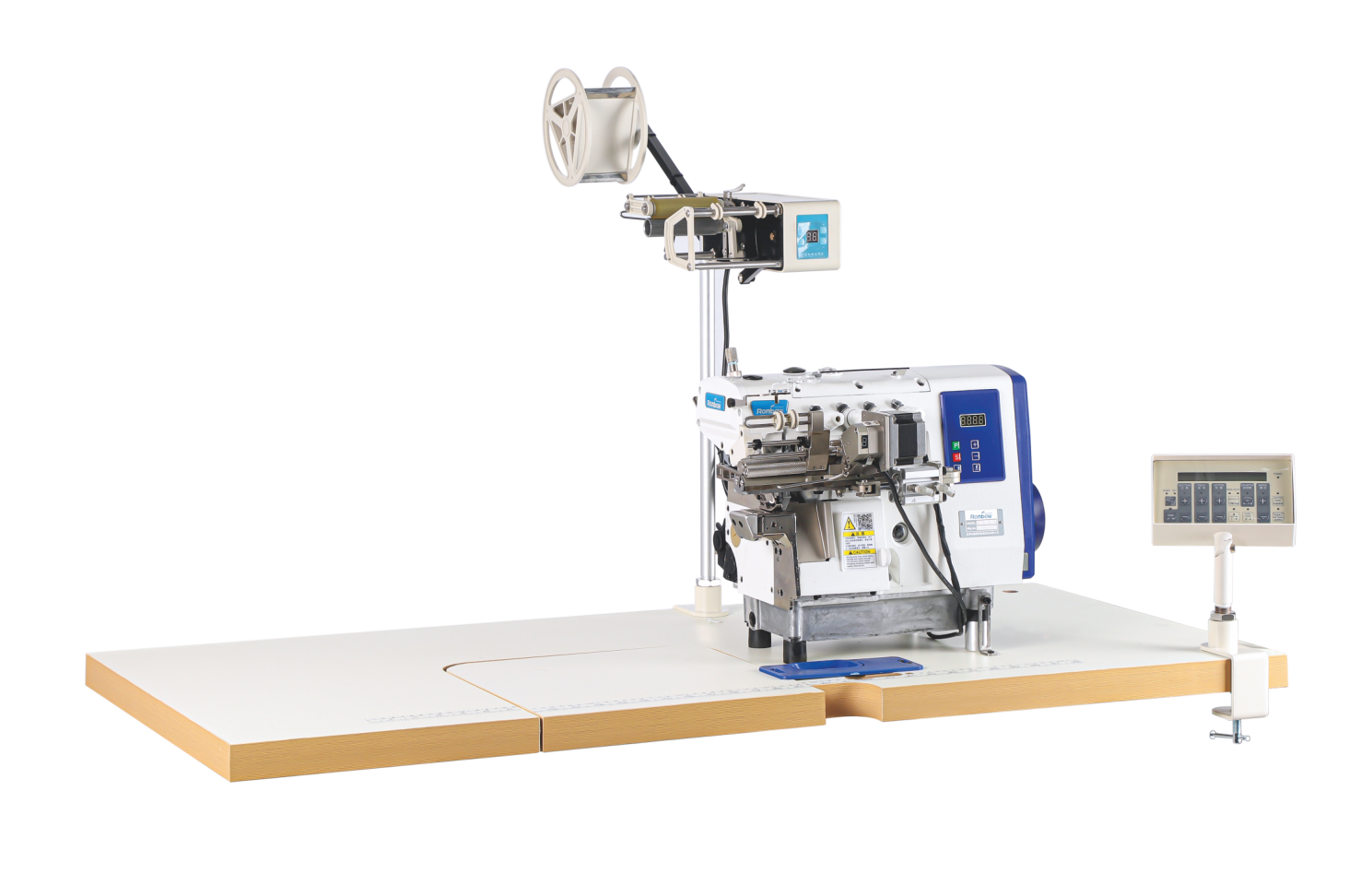 微电脑辅助松带,用于将捆条、松紧带放松,保持无张力状态,自动切带及送带功能,可缝制各种松紧带制品。车缝松紧带可以在压脚前自动快捷切断,再重叠车缝,接头平整美观。